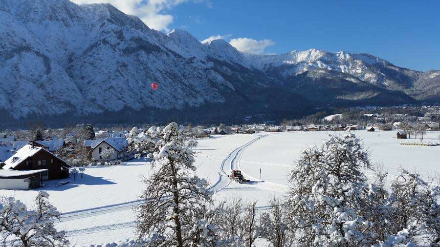 După mic-dejun, călătorie cu autobuzul public în Valea Gosau. Turul spre Goisererhütte (aceasta cabana este închisă iarna) și Hoher Kalmberg este o destinație minunată pentru o drumeție cu rachete de zăpadă, cu priveliste spre masivul ghețarului Dachstein și stâncile Gosaukamm. Ascensiunea bine marcată începe în Ramsau, mai întâi prin zone împădurite și printr-o zonă extinsă de pășuni alpine, cum ar fi Iglmoosalm și pe lângă numeroase cabane (din păcate inchise iarna). Traseul urcă printr-o pădure montană de molid prin Schartenalm și în direcția Goiserer Hütte. Odată ajunși acolo, vă puteți bucura de panorama fabuloasă a văii Goiserertal. În funcție de nivelul dvs. de pregătire fizică, puteți merge mai departe, trecând pe lângă biserica Kalmoos până la Hohe Kalmberg, înainte de a vă întoarce la Gosau și de a lua autobuzul spre Bad Goisern.
