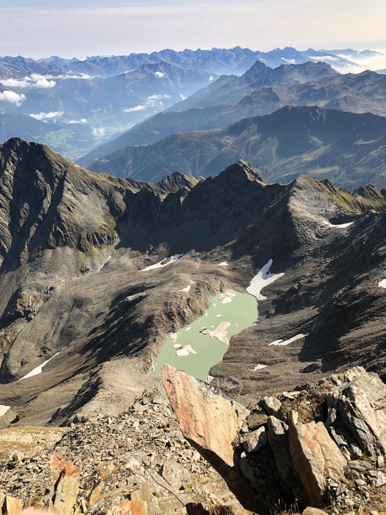 sub vârfurile Großer Hexenkopf și Hoher Eichham, în jurul vârfului Wunspitze (toate de peste 3000 de metri) și peste Eselsrücken. Vă veți simți cu adevărat precum un vultur – atât de fantastică este priveliștea asupra masivului alpin Lasoerling și a traseului parcurs în zilele precedente. În imediata apropiere a cabanei