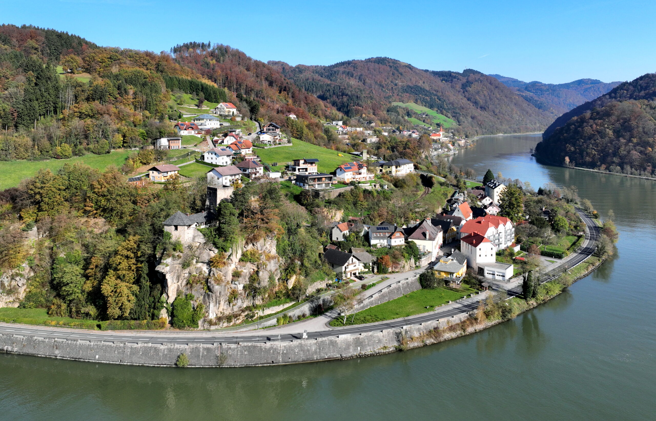 Pe traseul velo de-a lungul Dunării, veți trece pe lângă castelul Dornach și veți pedala prin frumosul oraș Grein, unde vă puteți plimba prin piața istorică până la teatrul municipal. Castelul Greinburg este cel mai vechi castel rezidențial din Austria și simbolul orașului Grein de pe Dunăre. Călătoria continuă pe versanții dens împăduriți ai Strudengaus, al cărui nume provine de la adânciturile („Struden”) din râu, care le cauzau dificultăți navigatorilor în trecut. Acum treceți pe lângă „Schwarzen Wand”