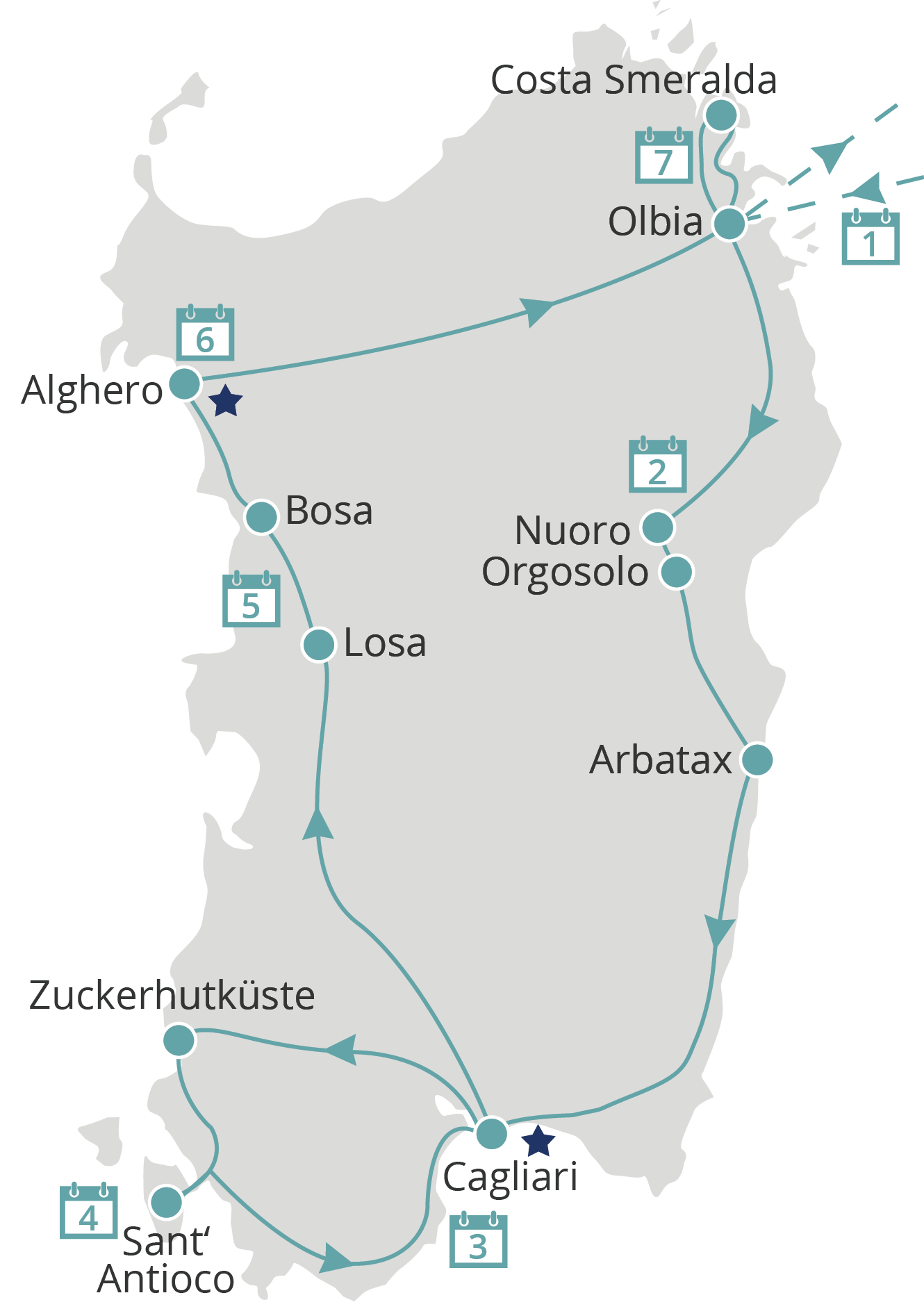 Sardinien – Jungbrunnen im Mittelmeer – 8 Tage Reise abwechselungsreiche Rundreise mit 2 Hotelstandorten Mit überproportional vielen Hundertjährigen gehört Sardinien zu den 5 „blauen Zonen“ weltweit. Doch was ist das Geheimnis der beliebten Urlaubsinsel? Ist es das gute Essen, die wunderschöne Natur oder dienen die lebenswerten Dörfer und Städtchen mit den vielen Traditionen den Hundertjährigen als Jungbrunnen? Erleben Sie auf dieser Rundreise mit den Hotelstandorten Cagliari und Alghero die Vielseitigkeit der Insel und machen Sie sich selbst ein Bild von der sardischen Lebensphilosophie. Top-Preise im Doppelzimmer: ab nur € 589,- € / Person im Monat April und im Oktober ab nur € 619,- € / Person im Monat Mai und im September ab nur € 669,- € / Person im Monat Juni Einzelzimmerzuschlag: 198,- € (inkl. angegebenen Zusatzleistungen, mind. 20 Teilnehmern) Reiseverlauf: 1. Tag: Anreise zur Nachtfähre nach Livorno Nachtfähre Livorno – Olbia 21:00 – 07:00 Uhr 2. Tag: Ankunft in Olbia – Orgosolo – Arbatax – Cagliari Panoramafahrt entlang der zerklüfteten Steilküste des Capo Caccia 3. Tag: Tagesausflug Cagliari vormittags Stadtbesichtigung von Cagliari, Hauptstadt am Engelsgolf 4. Tag: Tagesausflug Zuckerhutküste, Sant’Antioco und Costa del Sud Fahrt zur Zuckerhutküste “Pan di Zucchero”, steile Felsenküste bei Nebida 5. Tag: Tagesausflug Cagliari – Nuraghe Losa – Bosa – Alghero Fahrt durch das Landesinnere zur Nuraghe Losa, wichtiges Zeugnis der Nuraghenkultur 6. Tag: Tagesausflug Alghero und Neptungrotte vormittags Stadtbesichtigung von Alghero, die “spanische Stadt” Fahrt durch das Landesinnere an die Costa Smeralda 8. Tag Heimreise Inkludierte Leistungen: